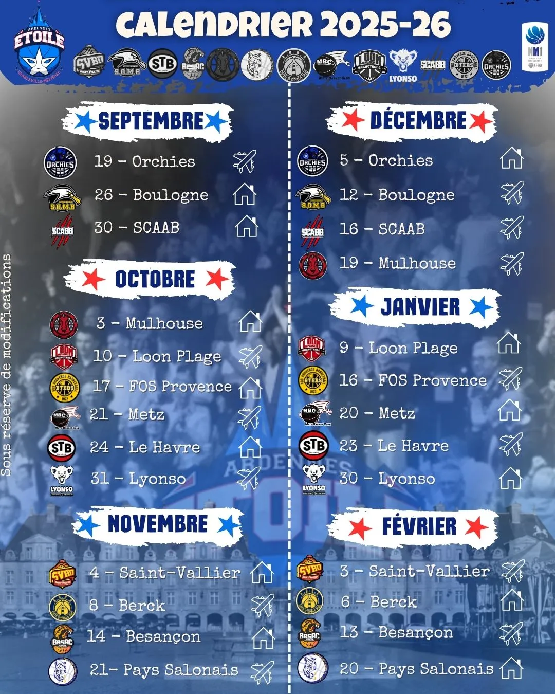 Retrouvez le calendrier officiel de l'Etoile de Charleville-Mézières.
