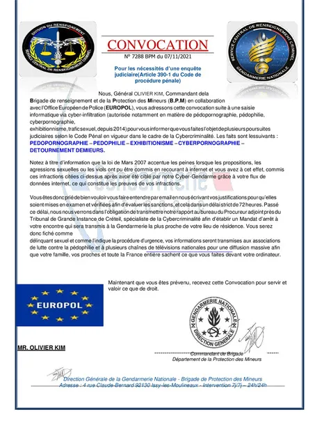 La gendarmerie nationale avertit de l’envoi de fausses convocations. Des usagers ont signalé la réception d’un faux courrier usurpant l’identité du général de corps d’armée Olivier Kim. Cette arnaque par e-mail vise à voler vos données personnelles. La gendarmerie nationale ne contacte jamais les usagers par mail pour une convocation. Ne répondez pas à ce mail. Et vraiment en cas de doute rendez vous dans la gendarmerie dont dépend votre domicile.