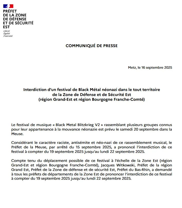 Considérant "le caractère raciste, antisémite et néo-nazi de ce rassemblement musical", Black Métal, le Préfet de la Meuse, avait déjà prononcé l’interdiction de ce festival à compter du 19 septembre jusqu’au lundi 22 septembre.