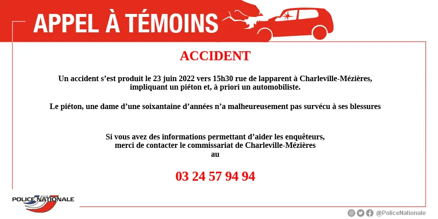 Toute personne ayant des informations sur l’accident doit contacter au plus vite le commissariat de police de Charleville au 03 24 57 94 94.