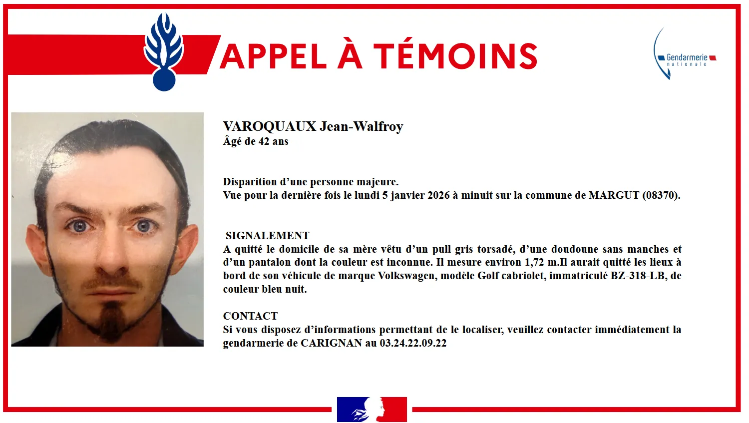 Si vous pouvez fournir la moindre information permettant de le localiser, vous pouvez contacter la Gendarmerie de Carignan au 03 24 22 09 22
