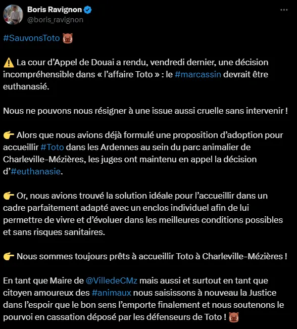 Boris Ravignon, le maire de Charleville a donc renouvelé sa proposition, il soutient la pétition et lance le hastag #SauvonsToto sur X. " Nous avions trouvé une solution idéale pour l'accueillir dans un cadre parfaitement adapté avec un enclos individuel afin de lui permettre de vivre et d'évoluer dans les meilleures conditions possibles et sans risques sanitaires" déclare Boris Ravignon sur le réseau social.